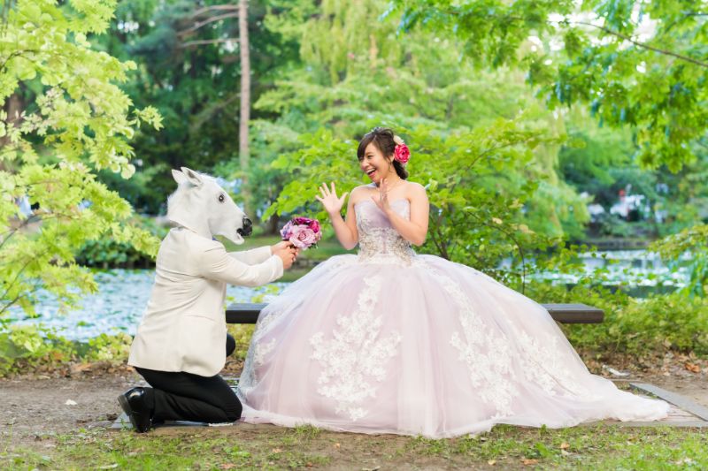 フォトフロップスやアニマルマスクを使った、遊び心あふれる前撮りフォトウェディングをご紹介