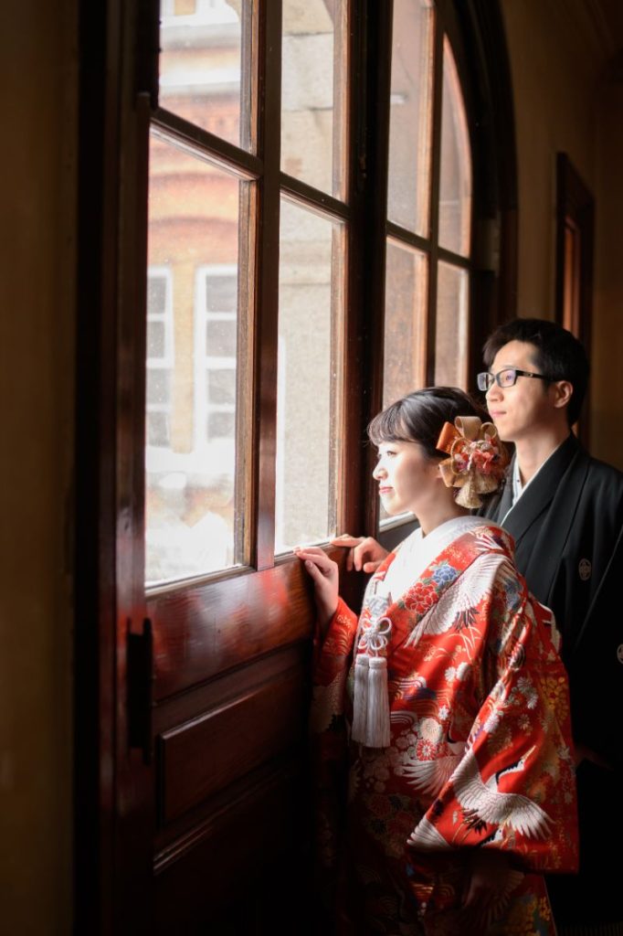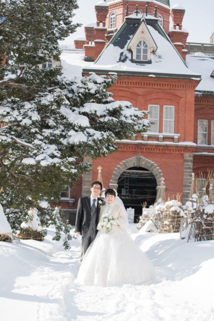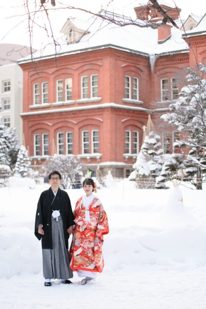 凛とした雪景色の北海道。白に映える白無垢と赤い色打掛