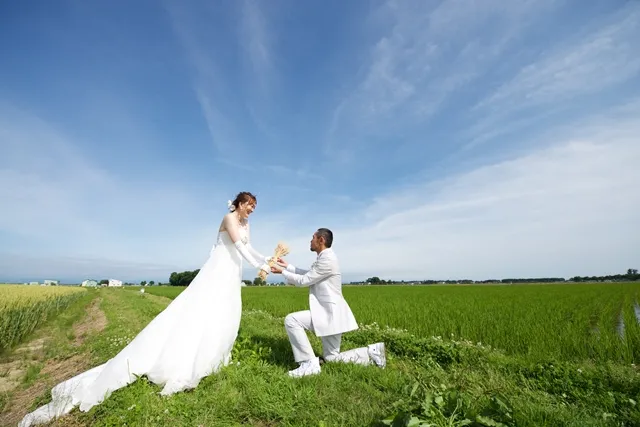 澄み切った青空と一面に広がる北海道の麦畑で叶えたフォトウェディング。家族集合カットやサプライズプロポーズなど、幸せが詰まったロケーション撮影事例をご紹介