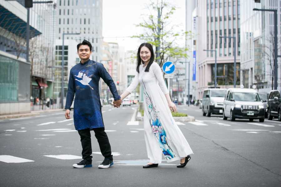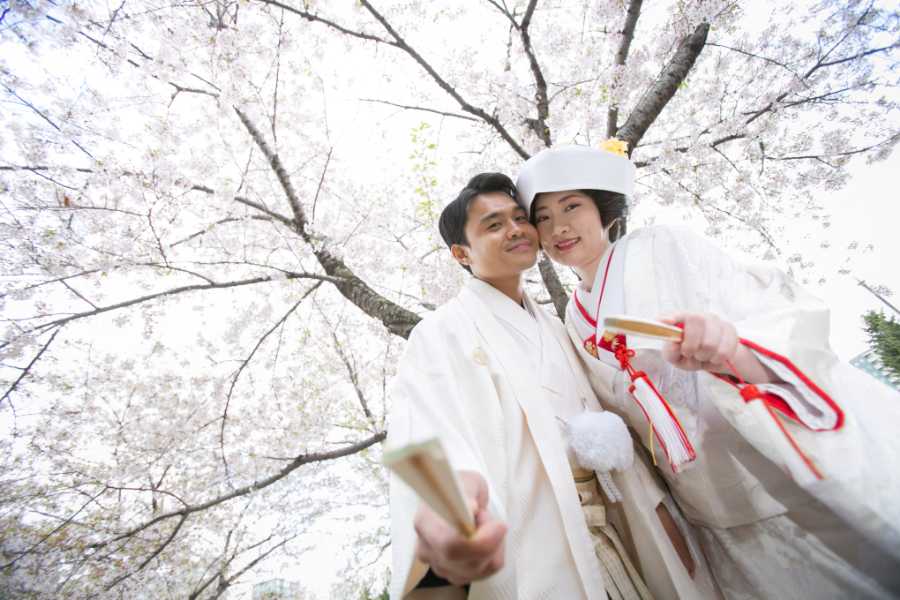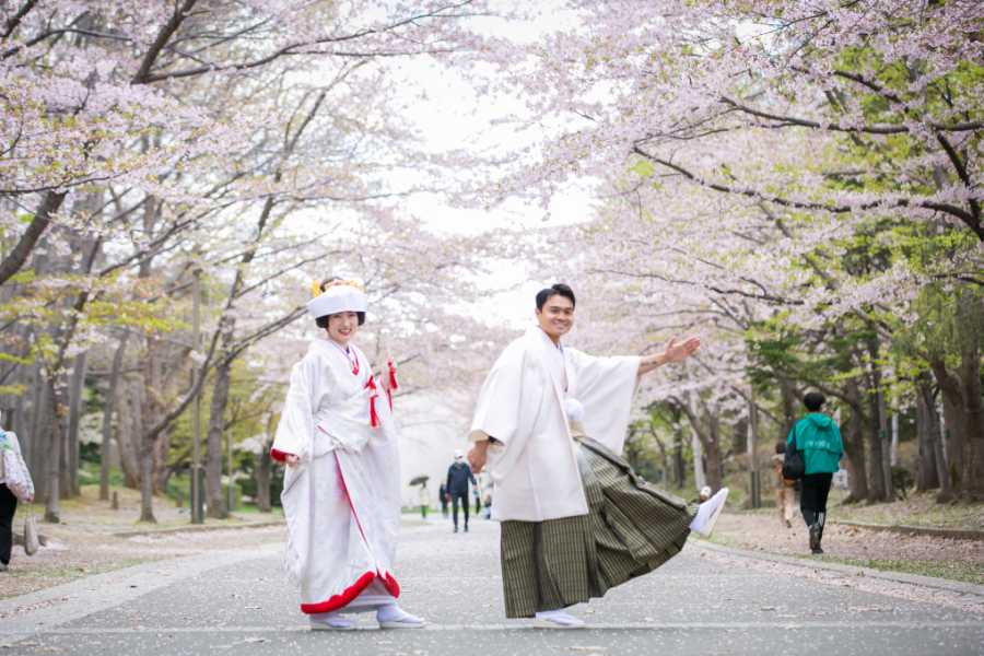 ご夫婦でエアー関係のお仕事で世界を回っているおふたり札幌で日本式の白無垢・紋付き袴でフォトウェデイングをご計画!アクティブに桜の季節、白無垢で叶えたフォトウェディング|弥彦神社・中島公園・永山邸・街ロケーションを巡るフォトウェデイング体験【ご新婦様の声】