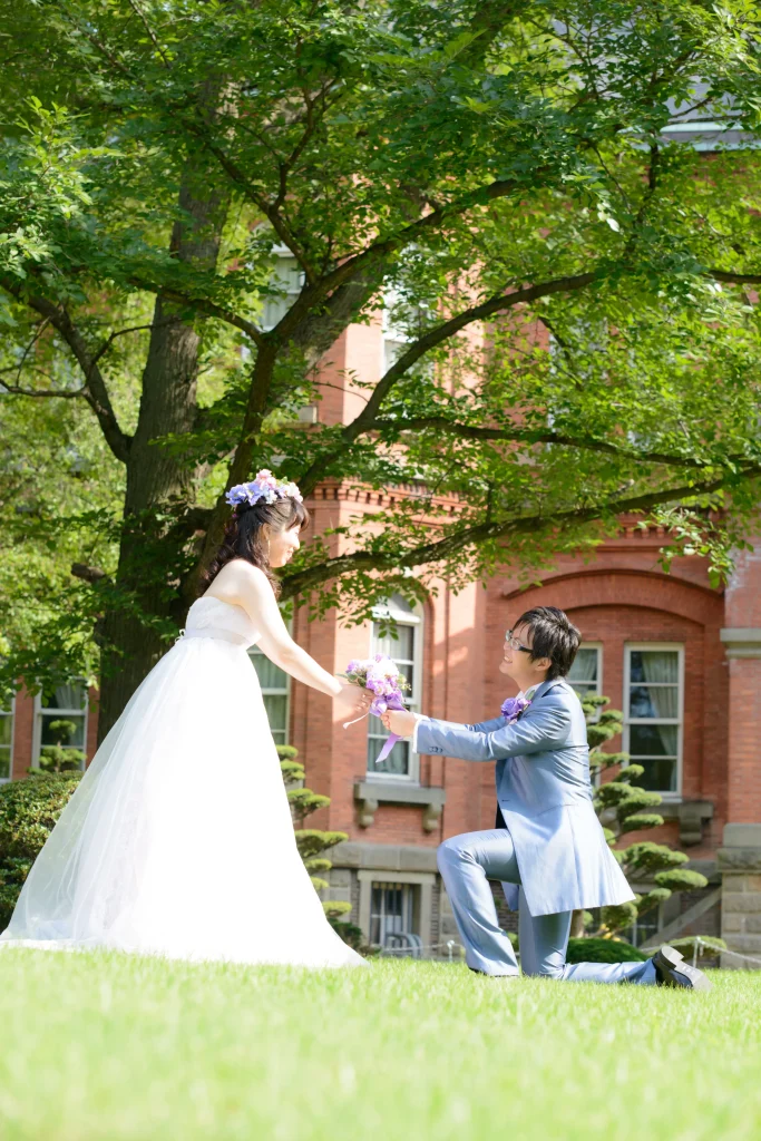 夏の日。お仕事一筋で忙しいご新郎のために、ご新婦さまが密かに計画したのは、大阪から札幌への旅行を兼ねた前撮りフォトウェディングでした。