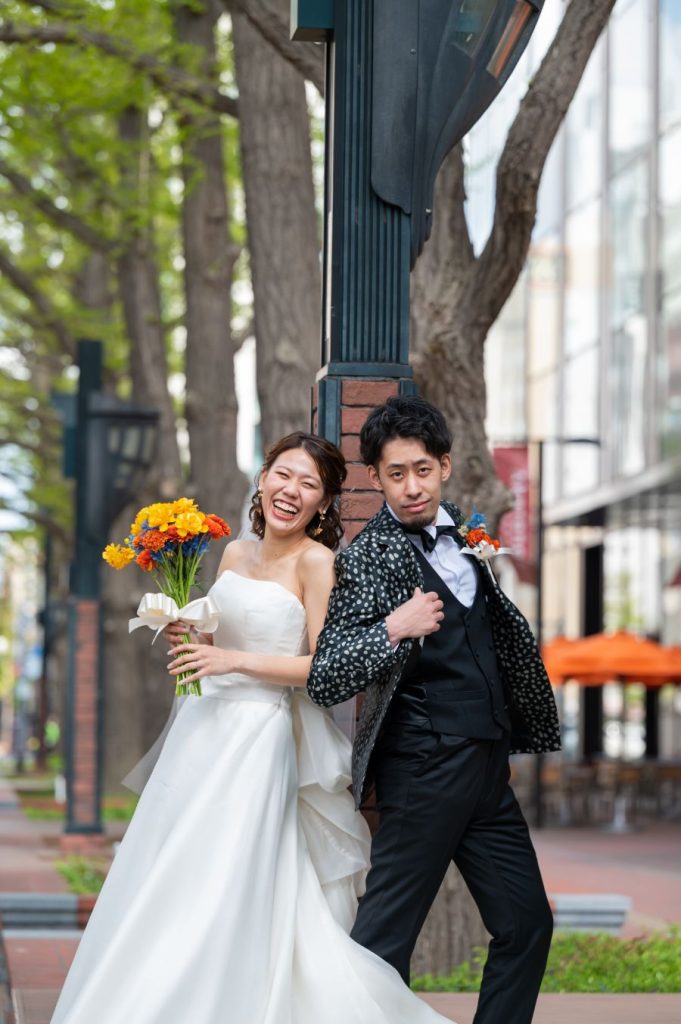 八重桜が咲き始めた道庁赤レンガ庁舎前庭(道庁公園)と旧永山邸を舞台に、色打掛とウェディングドレスの和洋装2点で撮影されたおふたりの体験レポートをご紹介します