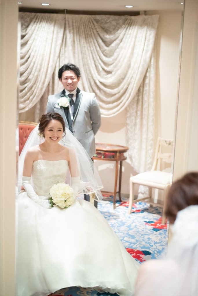 移動後光のチャペルのトリヴューンと呼ばれる鏡の間が設けられています。そこの鏡の間で気持ちを整えていざ写真だけ結婚式です