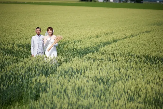 お2人が愛情そそいでるご自身の麦畑で撮影がしたい! 宮崎さまの最初のご相談でした。お話を聞くときちんと和装も着たいという…